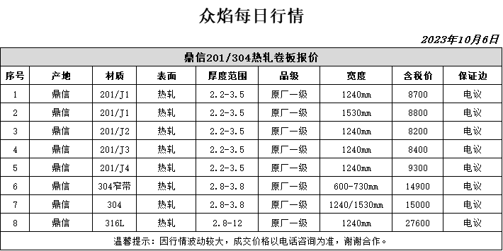 众焰每日行情2026年2月1日鼎信201/304热轧卷板报价序号产地材质表面厚度范围品级宽度含税价保证边1鼎信201/J1热轧2.2-3.5原厂一级1240mm8500电议2鼎信201/J1热轧2.2···
