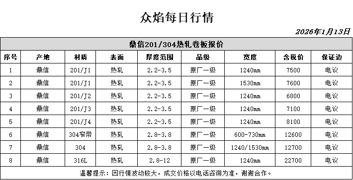 众焰每日行情2026年2月6日鼎信201/304热轧卷板报价序号产地材质表面厚度范围品级宽度含税价保证边1鼎信201/J1热轧2.2-3.5原厂一级1240mm8500电议2鼎信201/J1热轧2.2···